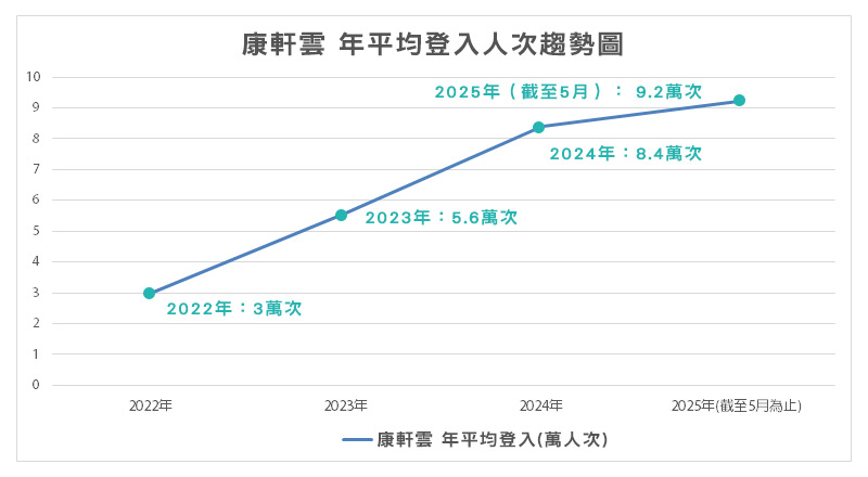 在教學全面數位化的推動過程中,從教師實際使用的雲端數據可清楚看見轉型的成果。以「康軒雲」數位教學服務為例,自2022年起至今,每年登入人次與網路使用量皆呈穩定成長:
